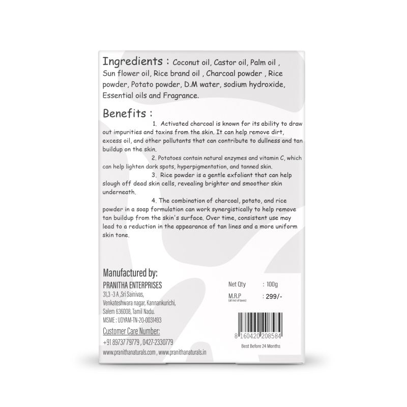 Activated charcoal is known for its strong absorption properties, helping to draw out impurities, toxins, and excess oil from the skin. Potato extract, rich in natural enzymes and vitamins, supports skin brightening and promotes an even skin tone.